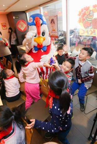 肯德基吉祥物奇奇与“小候鸟”进行互动。(新华网 江昆摄)