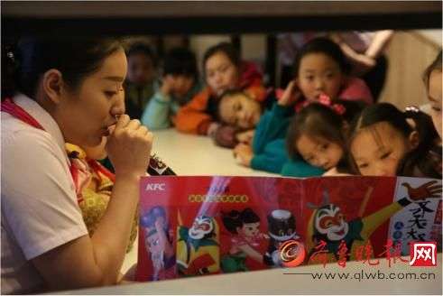 齐鲁晚报01月19日讯:1月18日上午,上海沪太路上的一家肯德基餐厅里,年味儿十足:玻璃幕墙上贴着“春”和“福”的窗花,天花板上垂挂下数十个大大小小形式各异的红色灯笼,连白色的筒灯上也挂上了鸡年剪纸画;餐桌上,一群孩子刚听完《四宝闹新春》的故事,又在故事姐姐的带领下,DIY起了红彤彤的新春灯笼。参加本次活动的儿童是外来务工人员子女,肯德基的新春故事会让这些“小候鸟”们提前感受到新春佳节的热闹的气氛。