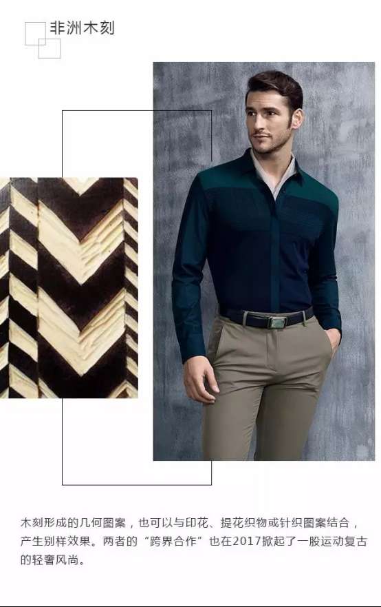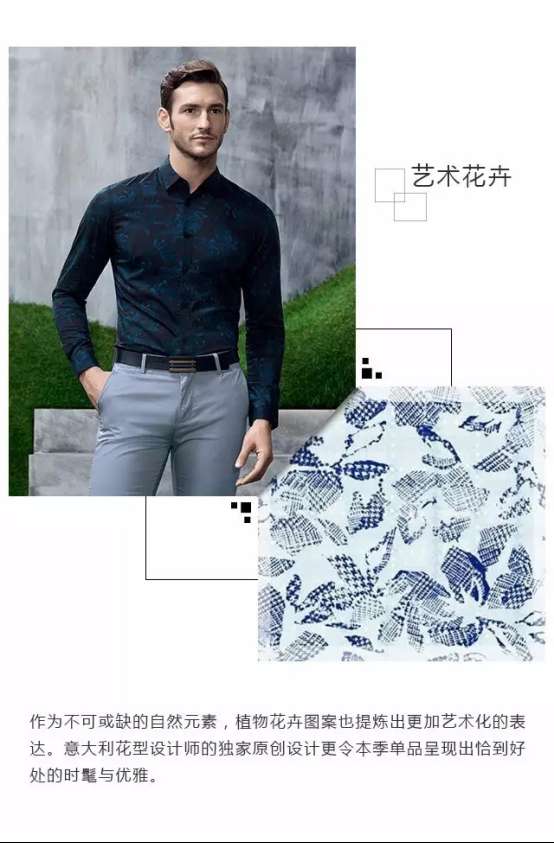 绿色生活方式的倡导,促使2017春夏商务休闲男装的花型流行更加趋于自然,也推动了运动风和现代感发展成为简约潮流,在这一季流行的花型元素中,随处能捕捉到它们的存在。