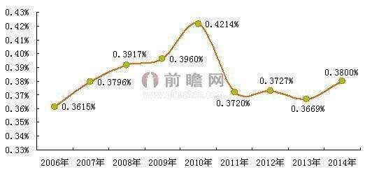 2006-2014年中国体育用品行业增加值占GDP比重(单位:%)