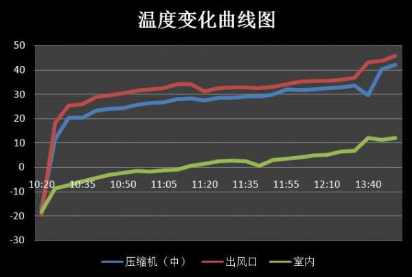 在最开始开机的5分钟内,空调出风口温度达到18.4℃,我们身处的这间房间温度从-20℃上升到-8.7℃,响应速度非常快;在11:40分时,监测温度出现了短暂的下降,这是因为空调此时进行了短暂的“化霜”。
