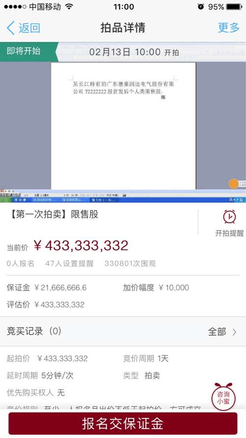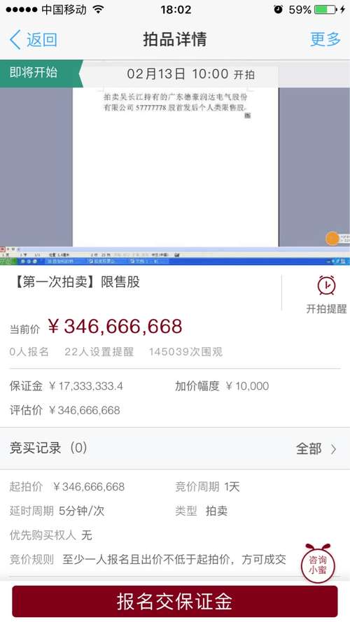 这批股权的拍卖时间为2月13日早上10时至2月14日早上10时,如在截止时间仍有人叫价,则后延5分钟,直到无人加价超过5分钟,则拍卖结束。不过记者了解到,截止到目前,这场社会关注的拍卖主角——竞拍者目前尚未露面。