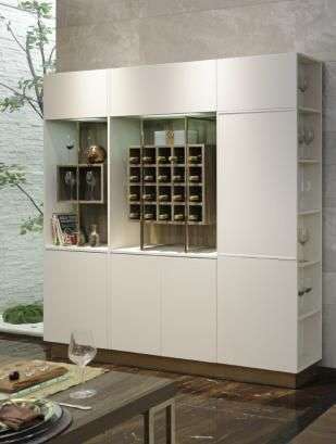 值得一提的是,欧派这套“流光溢彩”橱柜还有一个独立的酒柜与之相衬。风格上依然延续着简约大气,米黄亚光搭配格拉斯灰橡纹理,色彩雅致,配以金色元素,使得餐厅与厨房交相辉映,提升空间气质之余,又为平日乏味的生活平添一点点“小确幸”。