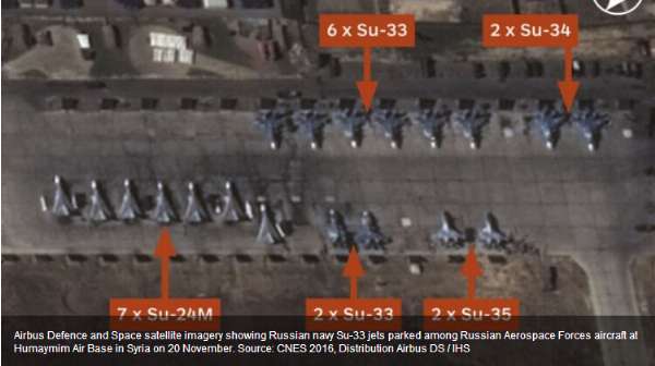 英国《简氏防务周刊》网站报道,根据最新卫星照片显示,俄罗斯海军“库兹涅佐夫”号航空母舰上的多架舰载机已经转场到叙利亚赫梅明空军...