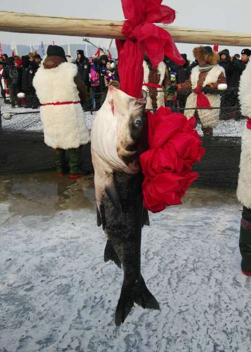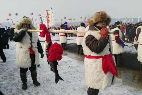 神州北湖冬捕节在向游客呈现这种极具北方特色的东捕活动的同时,也沿袭了古老的渔猎文化,再现了当年的渔猎盛况。此次东捕活动,采取用2000米的大拉网深入冰底网鱼,下网两次,共出鱼约11万斤。