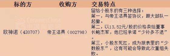 同时,2007年至今共有10余家新三板企业转板成功。而且自新三板扩容以来,只有3家公司IPO过会。按照目前过万家的挂牌企业来计算,新三板企业转板成功的概率不过千分之几。如果以这样的时间成本和概率来等待IPO,以“蛇吞象”式的并购实现“曲线上市”,对于上市门槛较高的建陶企业而言,未尝不是踏足资本市场的果敢尝试。