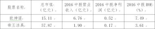 从规模和盈利能力上两相对比,欧神诺无论是资产、营收或是净利等均优于帝王洁具,且欧神诺体量是帝王洁具近3倍。
