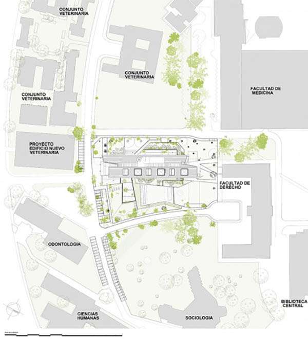 建筑坐落于国立大学校园之中,顺应着Leopoldo Rother所确立的校园总体规划格局。而在其周围错落地散布着法律与政治科学学院大楼、社会科学学院大楼以及兽医医药学院建筑组团等极具历史价值的受保护古老建筑。