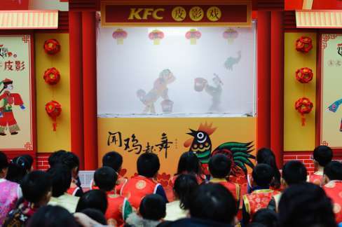 据介绍,除了在沈阳推出“东北皮影”主题餐厅外,肯德基还把南京的云锦、成都的蜀绣、陕西的剪纸、上海的金山农民画、北京的京剧脸谱等二十多种民俗艺术形式与餐厅装饰结合,打造出“百鸡百吉”主题餐厅,这其中也不乏列入联合国非物质文化遗产代表作名录的精品艺术形式。这些艺术将通过现代设计师提取民俗元素和地方特色,运用于餐厅的装饰中。