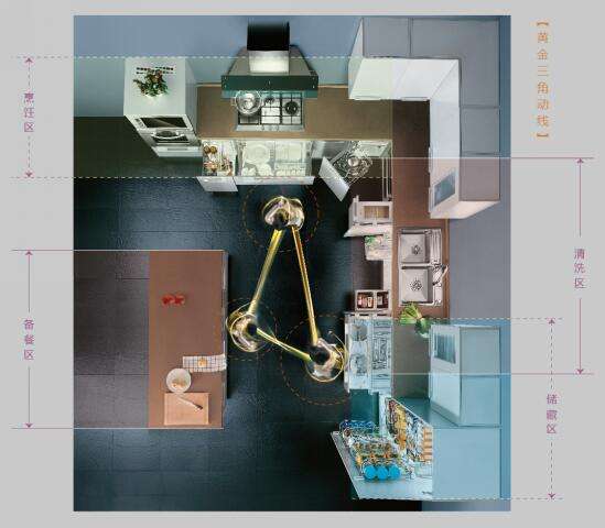 除了人体工学的高度设计,欧派还发现,在厨房中存在着收纳、洗理、烹饪、备餐四大功能区,这四大功能区结合人体特点、烹饪流程和餐具使用频率恰好形成直角或等腰黄金三角动线。在这个黄金三角区上,合理布局功能区之间的距离和空间关系,能有效减少走动距离和活动强度,使主妇们以最小的动能实现食材最高效的加工,操作更加轻松。