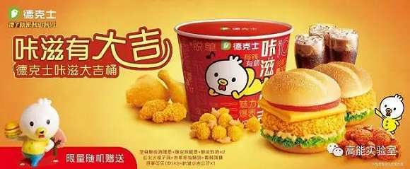 为迎接鸡年新春,德克士推出了“咔滋大吉桶”,一个桶里装有至尊脆皮鸡腿堡、脆皮鸡腿堡、脆皮炸鸡,还有两款颇具中式风味的小食——红火火辣子鸡和吉多多盐酥鸡。
