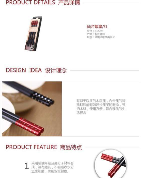 多样屋合金筷6入礼盒(灿若繁星红色)说明:材质安全:采用玻璃纤维及高分子材料合成,可高温消毒而不易变形。耐热温度:耐热温度220度,可用于洗碗机和消毒柜。不似金属筷般容易烫口。耐用:加强的硬度使其更加耐磨,经久耐用。筷端采用防滑设计,易夹取食物。环保:做为传统筷子的升级产品,更有利于节约木材。不使用油漆,长期使用不会发霉。健康之选!清洗说明:清水洗净或擦拭后,可放入消毒柜(高温)消毒烘干