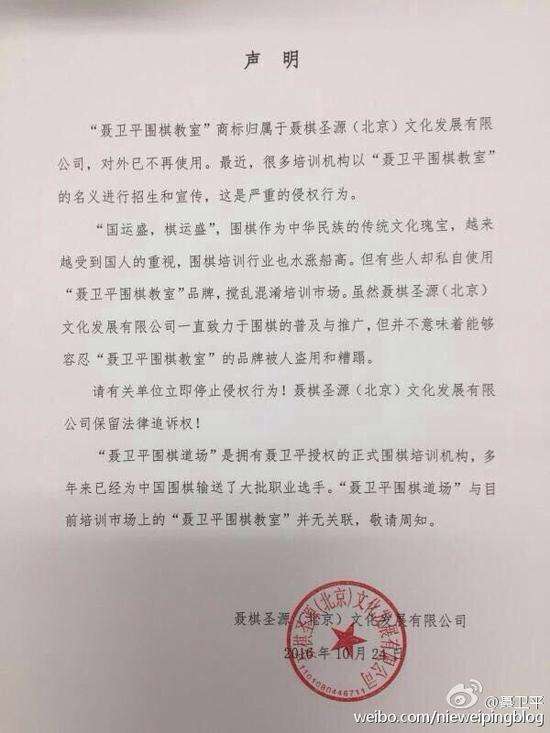 “聂卫平围棋教室”商标归属于聂棋圣源(北京)文化发展有限公司,对外已不再使用。最近,很多培训机构以“聂卫平围棋教室”的名义进行招生和宣传,这是严重的侵权行为。