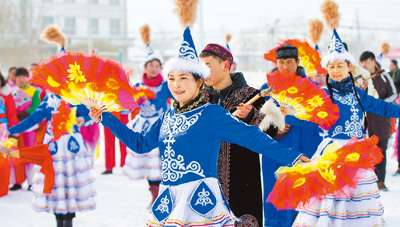 春節期間,新疆維吾爾自治區精河縣八家戶農場舉行新春社火巡游活動。