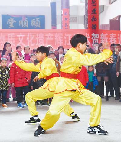 大年初二,江西新余市渝水區人和鄉觀下祠堂內,輝江村武術隊帶來精彩的武術表演。