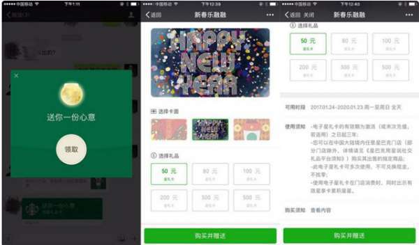 可送的礼品分为两种。一种是“请你喝咖啡”,也就是单杯咖啡,分两种主题,每种6款饮品;另一种是“星礼卡表心意”,可以选择6种不同主题、每种主题3种卡面和6种面值的星礼卡(卡面图案远超过实体卡片)。发送形式跟转账和发红包一样,只不过橙色的界面变成了星巴克绿。对方领取后,卡券会储存在微信卡包中,到门店后扫二维码就能拿到咖啡了。