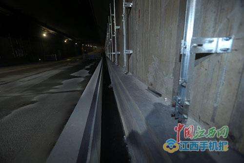 隧道内限高4.5米,限重55吨,严禁托载易燃易爆品车辆驶入。防水工程采用进口止水带,每个接口采用双道防水,每一节通道在预制过程中采用抗渗混凝土,属两道以上防水,设计使用年限100年。碰到降雨积水,因进出隧道口设置了横截沟,可及时排至两侧排水泵房。排水泵由液限仪自动开启,如果水量超标,将启动应急预案加泵排水。另外,红谷隧道抗震烈度为7级,不怕遭遇船只“触礁”或抛锚等状况。