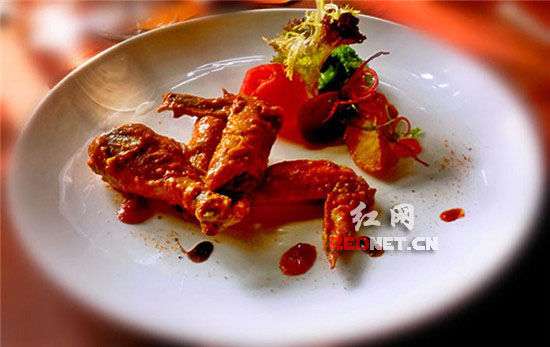 南都鸡。听名称以为是整只鸡,上桌才发现是鸡翅鸡腿各一对,外观并无特别之处,但吃下去才不得不辣到尖叫。原来在保留鸡肉鲜嫩爽滑的口感同时,表层增加了从墨西哥空运而来的辣椒酱佐味。作为嗜辣的湖南人民来说,这是一道非常有异域风情而又接地气的创新主菜。