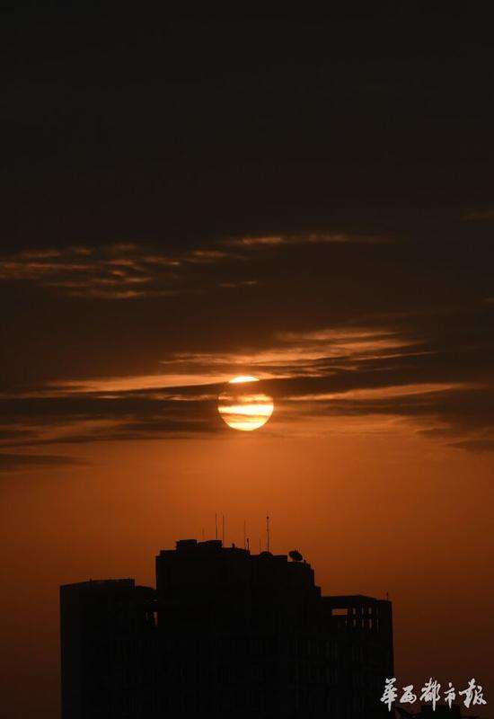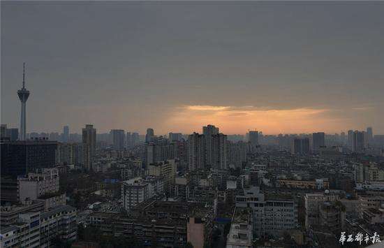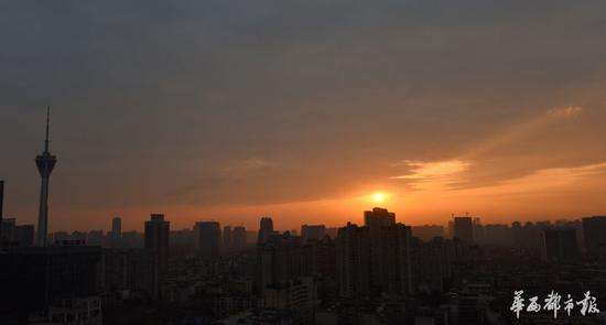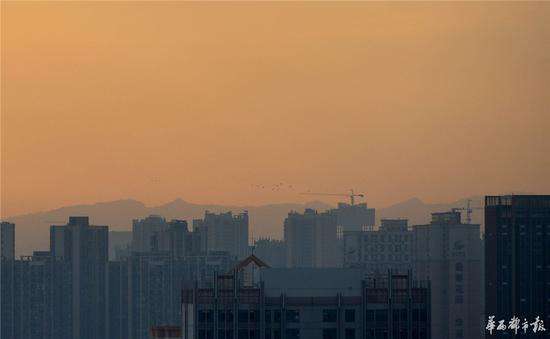 2017年2月8日清晨,老天在成都上空打开一扇天窗,窗内朝阳可视霞光沸腾,飞鸟腾空,龙泉山脉在市区里也清晰可见,