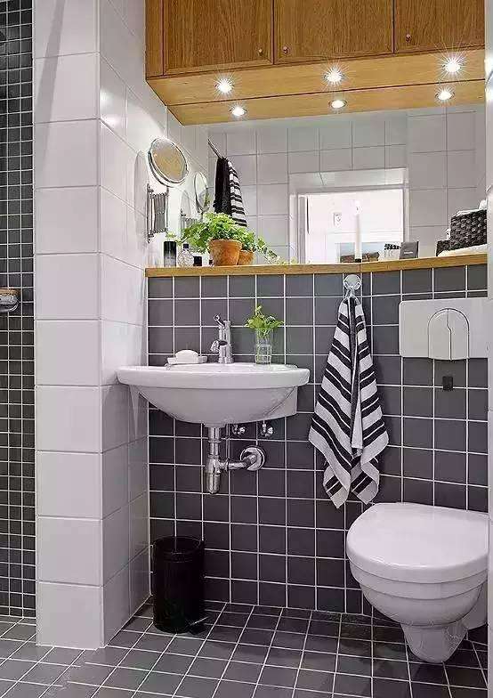 如果卫生间的瓷砖选择的是有逼格的暗色调,可以用一点木色来达到中和的作用。毕竟灰色虽然好看,但看起来会更显小啊。