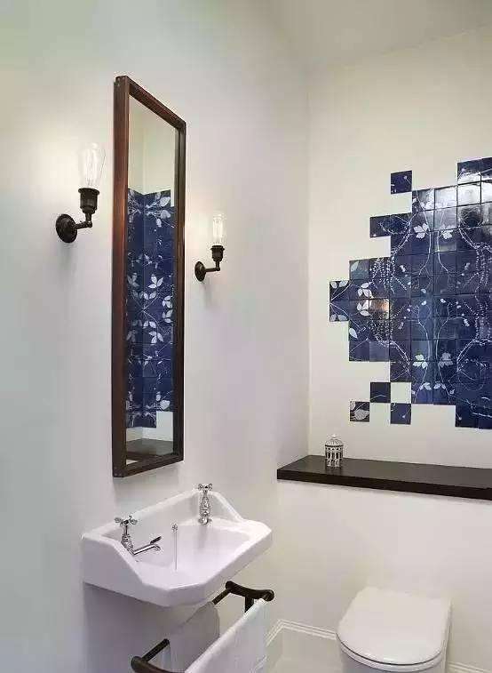 拼贴的马赛克图案,也为平淡的空间增添了亮点。面盆、马桶都是简洁轻巧的设计,更适合小卫生间。