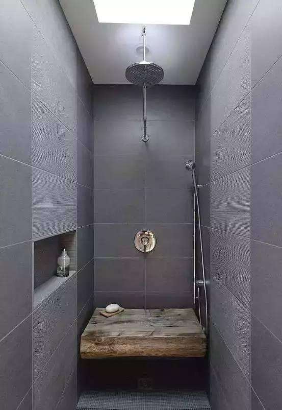 这个也是同理,浴室实在是太小了,而且使用的是深灰色的墙地砖,更显压抑。但是加了块原木的坐板,让空间变得自由粗犷了些。