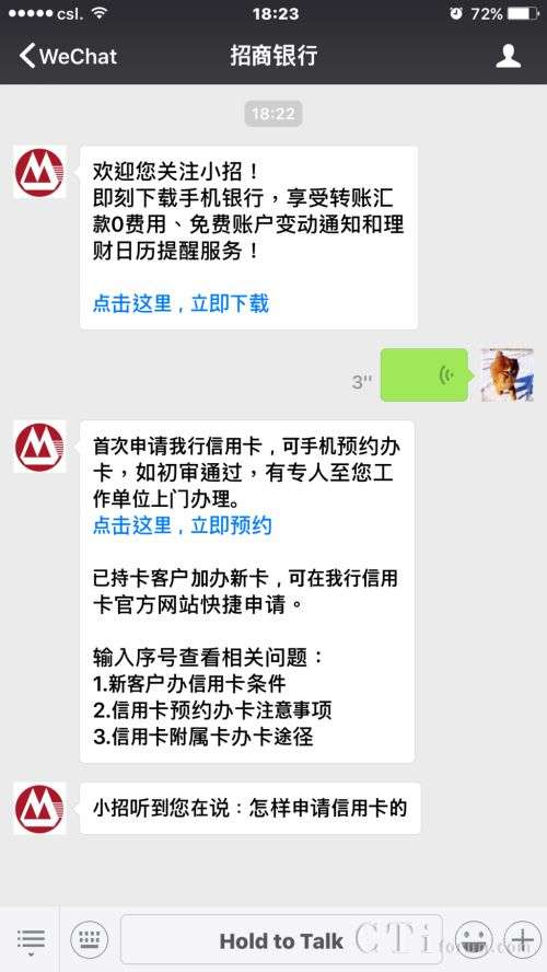 在招商银行的WeChat帐户中,所采用的是小i系统,它支援语音信息,分析用户提出的问题,如「怎样申请信用卡」,并即时提供答案。小i机器人总裁及CTO朱频频称,招行使用智能客服后,虽然减少客服人手,但客服并无失业,只是改为从事更多关于市场营销的工作。他相信,智能客服不会抢人的饭碗,因人类不能只从事重复性高、低水平的工作,可从事更多具创意的工作。