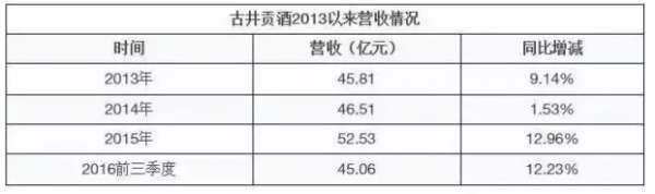 从整体来看,2013年,古井贡酒营业收入45.81亿元;2014年完成46.51亿元,涨幅1.53%;2015年完成52.53亿元;2016年度前三季度完成45.06亿元。