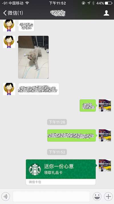 选定好这些饮品或者主题后,赠送给朋友就像给他转账和发红包一样,只不过红包的颜色变成了星巴克绿,你甚至可以在赠送过程中写下留言或者上传上一张图片。对方领取后,卡券会储存在微信卡包中,到门店后扫二维码就能拿到咖啡了。