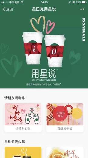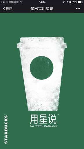 前不久,微信宣布与星巴克合作,在线下星巴克门店可使用微信付款,现在微信与星巴克携手推出了“社交礼品体验”--用星说,用户可以在线购买单杯咖啡兑换卡或“星礼卡”(储值卡)赠送给微信好友,并在赠送界面用文字、图片、视频留下你对TA的专属祝福。