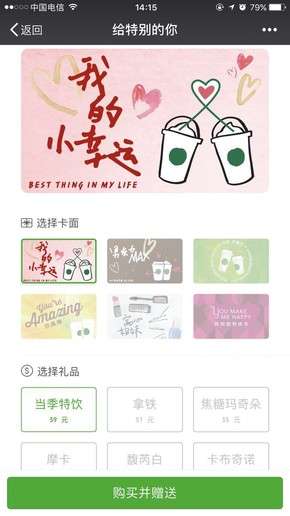通过微信点单可使用不同的主题,另外在留下祝福页面还可以添加文字等内容,表达自己的心意。获赠者可通过微信卡包查看详情,并前往星巴克门店使用,非常方便。