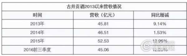 从整体来看,2013年,古井贡酒营业收入45.81亿元;2014年完成46.51亿元,涨幅1.53%;2015年完成52.53亿元;2016年度前三季度完成45.06亿元。