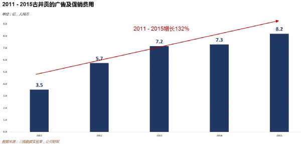 2011至2015年期间,古井贡的收入增长了59%,但广告及促销费用增长了132%,前者的增速是后者的44%;同期洋河的收入增长了26%,广告及促销费用增长了37%,前者的增速是后者的70%!明显人家洋河的钱才是花在了刀刃上,求古井贡的管理层长点心吧。。。