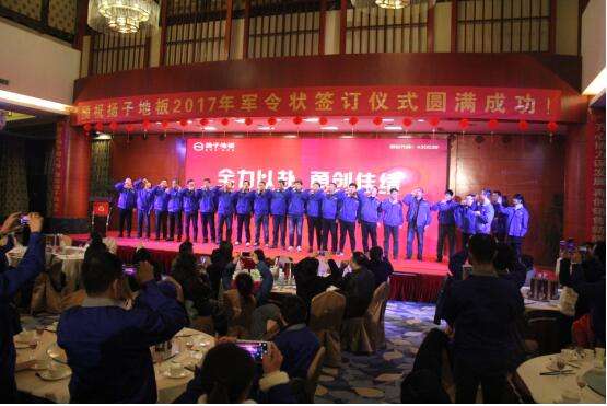 2月7日,扬子地板2017年军令状签订仪式暨销售精英出征酒会在滁州冠景泊悦酒店庄严举办。董事长雷响先生、副董事长张俊娥女士等公司高管团队、高级管理顾问黄永刚先生、财会事务所朋友与营销中心销售精英、后勤人员近一百人参加了此次仪式。