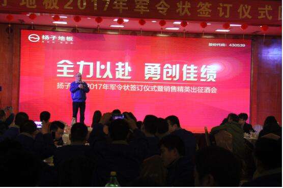 在热烈的氛围中,分管公司研发生产制造的杨晓刚副总裁上台,向大家郑重承诺时刻以“工匠精神”要求自己,为各位营销精英占领市场、完成目标提供有竞争力的产品武器。分管后勤管理职能部门的后洁副总裁在致辞中表示将会以“有效的评价机制”开展组织建设、机构变革,支持公司2017年目标责任的细化分解与分步实现,支持企业目标与职业目标双通道的达成。雷响董事长在讲话中指出,2017年在扬子地板15年的发展历程中将会是一个创新年、一个变革年,一定要总结反思过去发展过程中存在的问题,以不断学习改进的精神,为公司越过一个又一个目标里程碑。