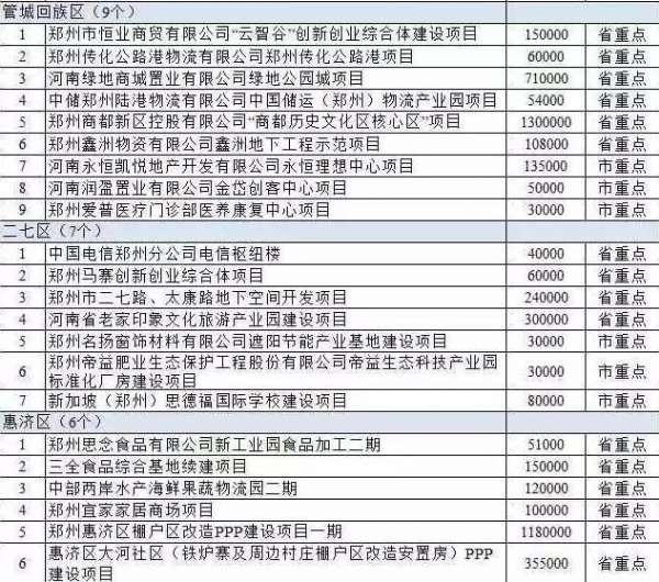 惠济区6个,包括郑州思念食品有限公司新工业园食品加工二期、三全食品综合基地续建项目、中部两岸水产海鲜果蔬物流园二期、郑州宜家家居商场项目、郑州惠济区棚户区改造PPP建设项目一期等。