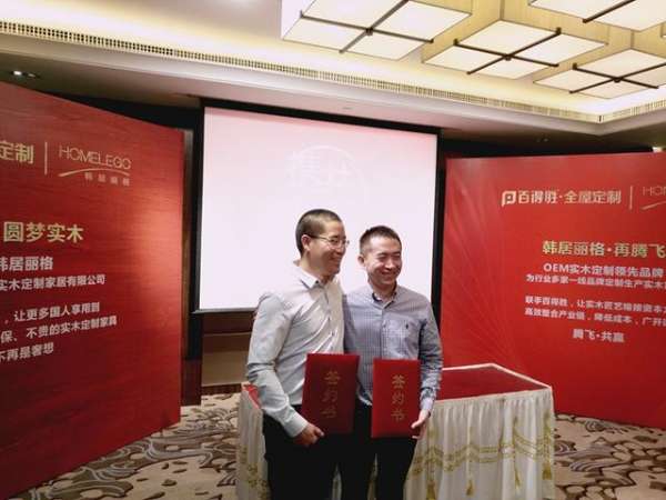 2016年12月9日,百得胜&韩居丽格签约仪式暨媒体见面会在广州隆重举行。百得胜执行总裁张健先生与韩居丽格总经理苟良朝先生进行签约,正式对外宣布双方携手合作。在签约仪式上,百得胜执行总裁张健先生发言提出“实木定制将是定制家居行业下一个风口”,并正式宣布百得胜将向实木定制发力。