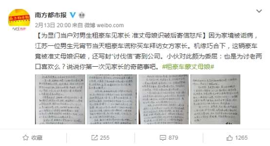 事情发生在元宵节后,一名男子向某微博大V发帖求助,称“干了一件让自己追悔莫及的事”。女友家庭条件比较好,而自己却是一个普通工薪家庭孩子。为了给女友父母留下一个好印象,和女友商量在神州租车租了辆宝马谎称自己买的车开回家充面子,却被精明的准丈母娘识破。后来准丈母娘写了一封信直接揭发了该男子谎言。