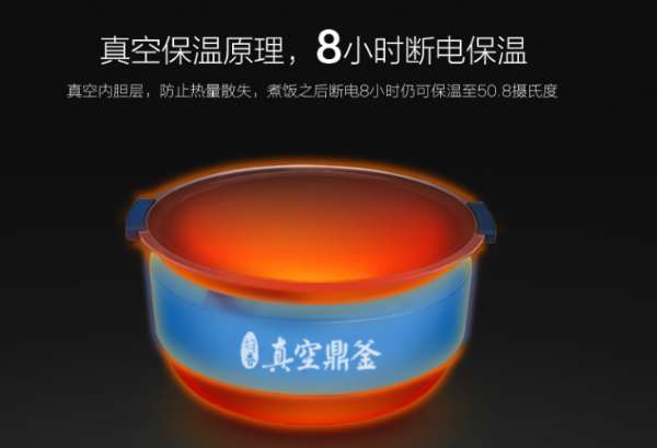 新款真空变压IH电饭煲拥有业界首创真空鼎釜。真空内胆保证强力聚能锁热,热量不易流失,提高热能的利用率。让米饭充分熟化的同时减少能源浪费。依赖这一特性,该款电饭煲可以实现断电 8 小时仍可保温至 50.8℃的惊人效果。