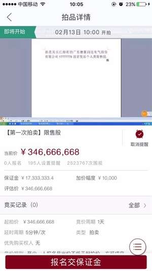 据悉,两个拍品起拍价需要预付的保证金高达2100万和1700万,而如果有人拍下后反悔,法院会悉数没收巨额保证金。