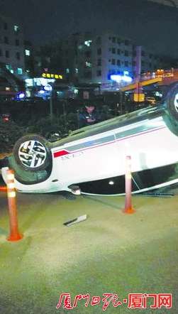 (文/图 记者 房舒)眼看一辆白色小车腾空之后转了270度,“背”朝下,砸在路面上,路过此处的小伙小肖,先是看傻了眼,紧接着“赶紧救人!”昨日傍晚6点半左右,在集美大道附近,一辆小车不慎撞到限高杆后,凌空飞起,而车上还有一个孕妇!
