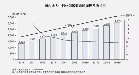 太平鸟集团下属品牌基本上聚焦于国内成人中档休闲服装市场。据Euromonitor统计,2016年国内成人中档休闲服装市场规模约为2418亿元。到2019年,该规模预估达到3039亿元。2010-2019十年间,成人中档休闲服装市场规模呈现高增长速度,复合年均增长率为10%。