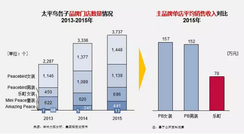 从各品牌线下门店分布来看,Peacebird女装门店数量最多,2015年达到1448家,占整体门店数量近四成;Peacebird男装门店数量为1139家,占整体门店数量的三成;乐町女装门店数量为696家,占整体门店数量的近二成。面向新兴品牌成长,如Amazing Peace,也已开设相当规模的门店。如果与各品牌的收入贡献占比相比较,PB女装与男装品牌的门店数量份额与其收入贡献基本相当,甚至男装更为突出,约占集团三成的门店数贡献了总收入的35%。