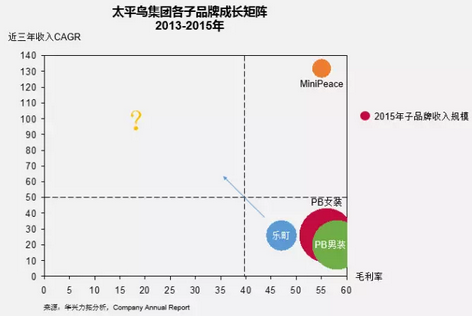 创立五年的童装品牌MiniPeace表现出强劲的增长势头,近三年的收入CAGR甚至超过了130%,毛利率也达到了55%,成为太平鸟的明星品牌。MiniPeace的成长无疑抓住了新一波主力80后消费人群结婚生子对于品牌童装的增量需求,尤其对于已经成为PB女装和男装忠实客户的年轻父母会产生很强的购买转化。