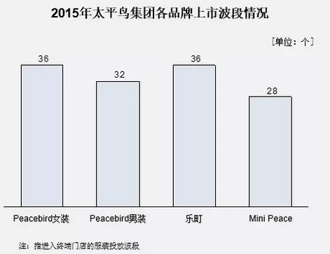 2015年,太平鸟集团服装颜色投放数量为8632款,相较于2013年数量增长了10%,也就是当年平均每个品牌一年上新1700款。与此同时,太平鸟集团在上货波段上也极为高频。2015年,Peace Bird女装上新品36波段,Peace Bird 男装上新品32波段,乐町上新品36波段,Mini Peace 童装上新品28波段。平均下来,零售门店确保平均每1-2周上一次新品。