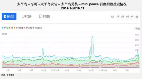 通过百度搜索指数可以看到,从2014年到今年,太平鸟、乐町、太平鸟女装、太平鸟男装、mini peace等品牌均会在双十一前后达到搜索强高峰,太平鸟集团在引流和互动效果上可谓十分显著。