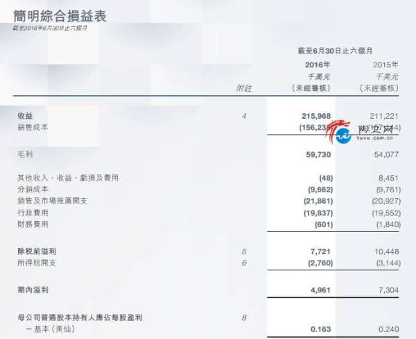 据顺诚公布的最新财务报告显示,顺诚2016年6月止上半财年业绩,收益录得2.16亿美元,按年增加2.2%。纯利496万美元,倒退32%,每股盈利0.163美仙。中期息3分人民币,上年同期派5分人民币。2015年全年业绩销售净额为43,510万美元,相比2014年的41,580万美元增加1,930万美元或4.6%。2015年度溢利由2014年的1,750万美元减少至280万美元。