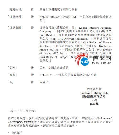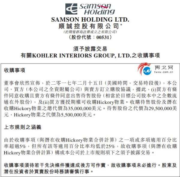 陶卫网讯 2月16日,顺诚控股有限公司发布公告,顺诚全资附属公司Samson Investment Holding,Co.与美国科勒Kohler Co.订立购股协议。Samson向Kohler收购KohlerInteriors Group, Ltd全数股权,涉资2950万美元,以及获授期权可收购位於美国北卡罗莱纳州之办公室、制造基地及仓库物业,涉资550万美元。此次收购涉资共3500万美元。
