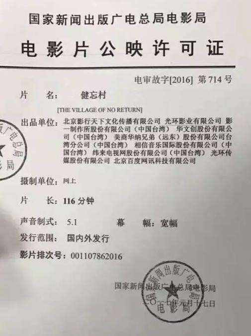 2016年9月,《健忘村》宣布台湾定档2017年大年初一,彼时还未公布大陆映期。不过就在一个月后,电影宣布与台湾同档期在大陆上映。