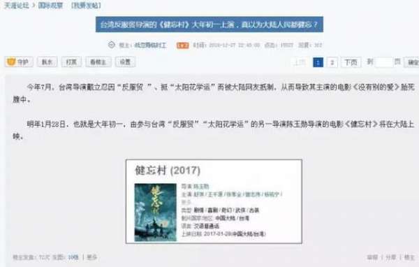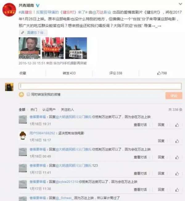 此事迅速发酵,到今年1月初,“《健忘村》导演反服贸”的新闻被各大门户网站和媒体报道,这一次虽然没有共青团中央亲自出马,但共青团湖南省委员会官方微博“共青湖南”公开发博直言:“大陆不欢迎台独导演”。颇有意思的是,下面有不少网友留言的竟是“抵制万达”。